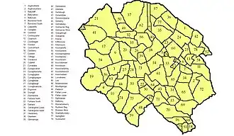 Civil Parishes were included on the nineteenth century maps of the Ordnance Survey of Ireland.[3] The Local Government (Ireland) Act 1898 established administrative counties divided into county districts (urban districts and rural districts) making parishes largely obsolete, and they were removed from subsequent editions of OS maps.[4] For poor law purposes district electoral divisions replaced the civil parishes in the mid-nineteenth century.