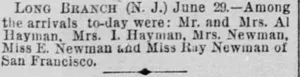 Long BKAHCB (N. J.) June 29.— Among tlie arrivals to-day were: Mr. and Mrs. Al Dayman. Mrs. 1. Ilayman, .Mrs. Newman, Miss K. Newman auU iftai Baf Newman of fcan Fraucisco.